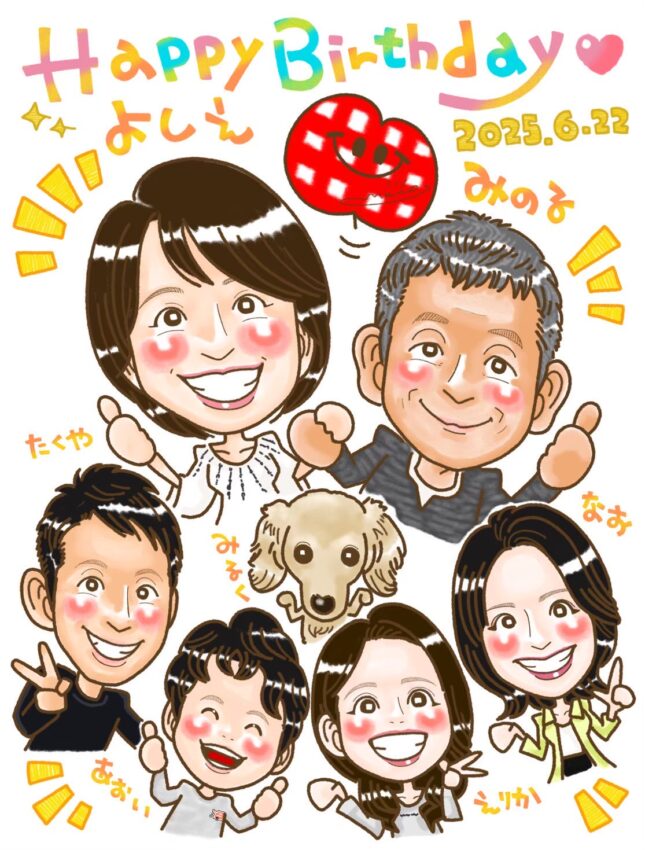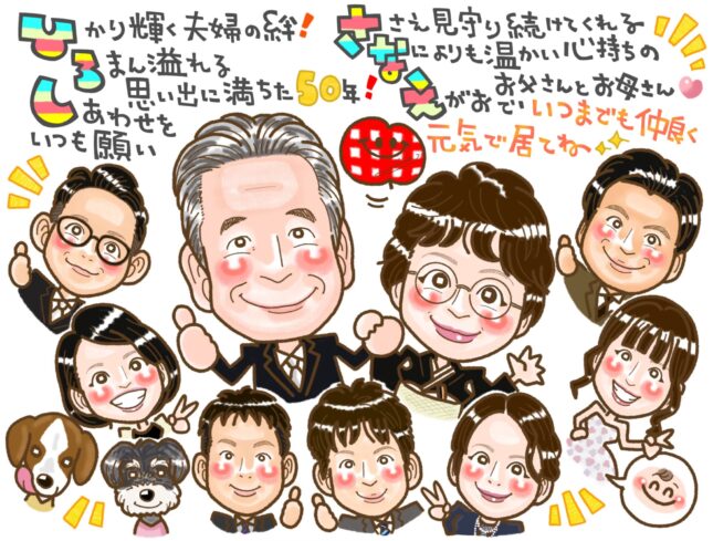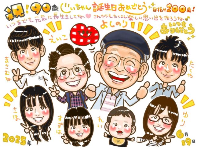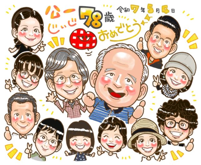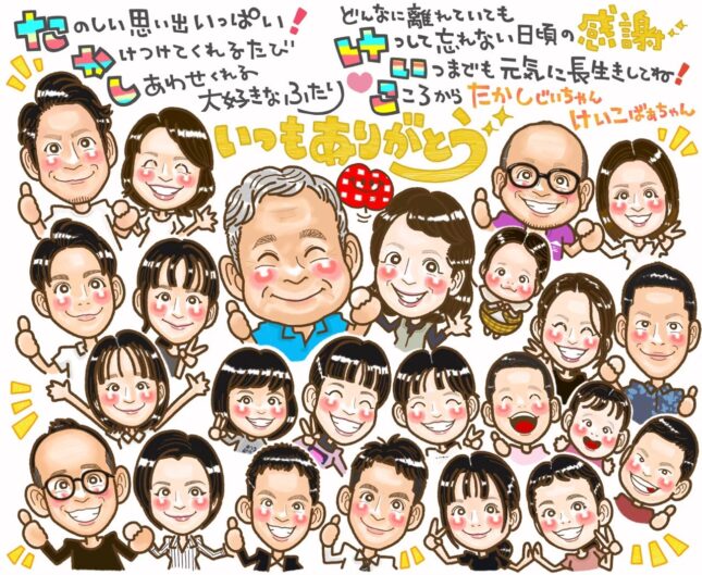 大好きなおじいちゃんおばあちゃんの長寿お祝いに三世代親戚全員集合した似顔絵はいかがでしょうか?