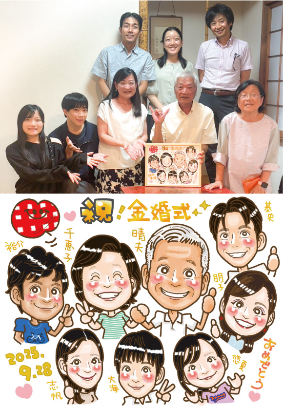 私の両親の金婚式祝いの食事会をして、ハッピーエンドeveさんの似顔絵を両親へプレゼントしました!