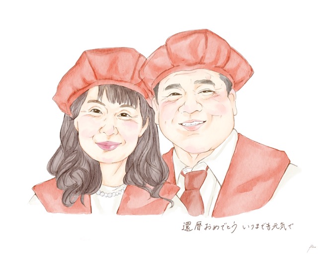 還暦祝いには、赤いちゃんちゃんこやご家族みんなを描く似顔絵が最適です。還暦でも特にリクエストが多く、記念に残る特別なプレゼントとなります。
