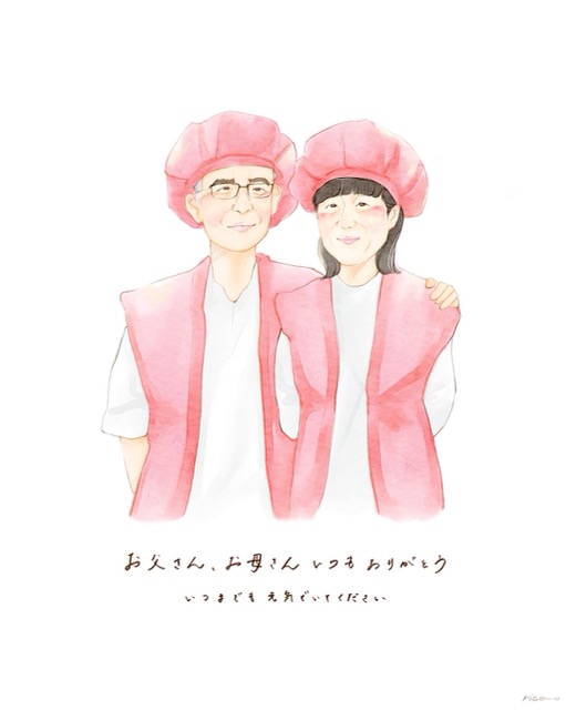 やっぱり定番人気のちゃんちゃんこをプレゼント。いつまでも仲良し夫婦でいてください。そんな思いのたくさん詰まった似顔絵ギフトを。二人の思い出の場所を背景にした似顔絵や初デートの場所、結婚式の会場、旅行先など、夫婦にとって特別な場所を似顔絵の背景に描きましょう。また夫婦のエピソードを元にして、名前詩を作成することも出来ます。イラスト:はっぴーえんどeve 商品価格:18,000円〜