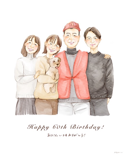 還暦のお祝いには、家族全員が描かれた一枚の似顔絵がおすすめです。 世代を超えて楽しめるこの特別な作品は、家族の絆を深めるだけでなく、お祝いの場をさらに盛り上げます。完成した似顔絵はお祝いの席でサプライズプレゼントとしてお渡しすることができます。 かわいい似顔絵、おしゃれなイラスト、シンプルタッチ等色々なタッチから選んでいただけます。絵:ひげストリーム 価格:12,800円〜