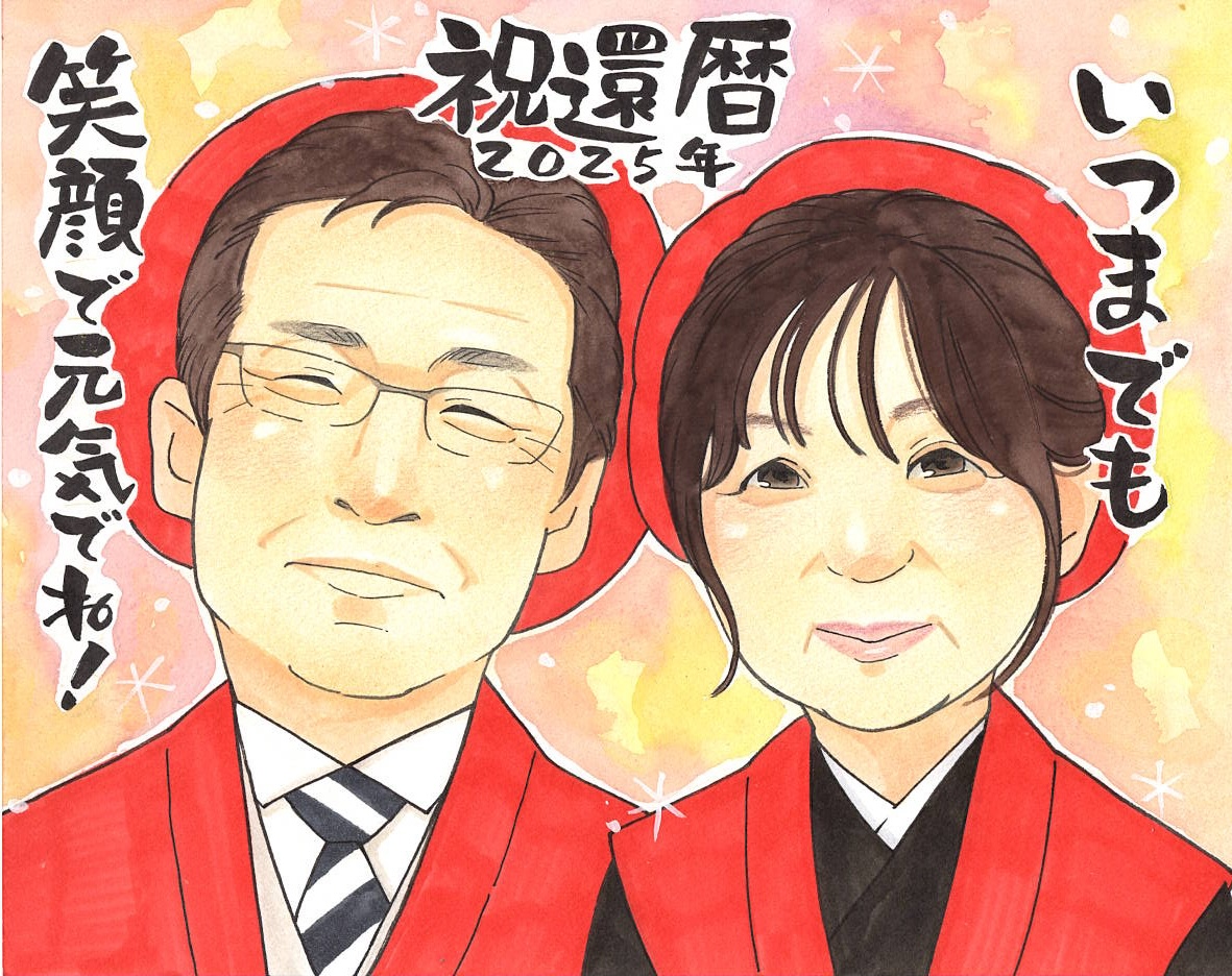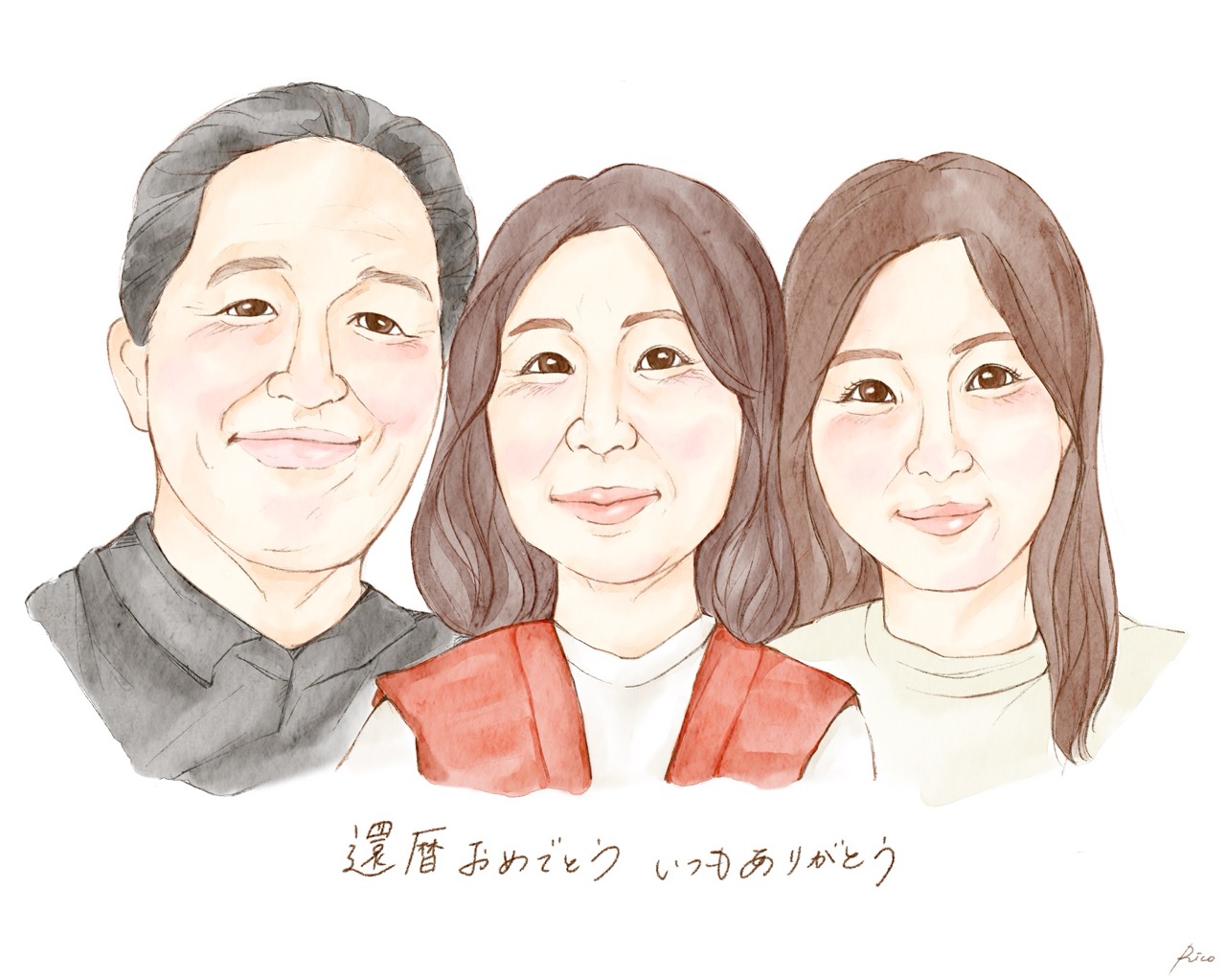 還暦祝いには、赤いちゃんちゃんこやご家族みんなを描く似顔絵が最適です。還暦でも特にリクエストが多く、記念に残る特別なプレゼントとなります。